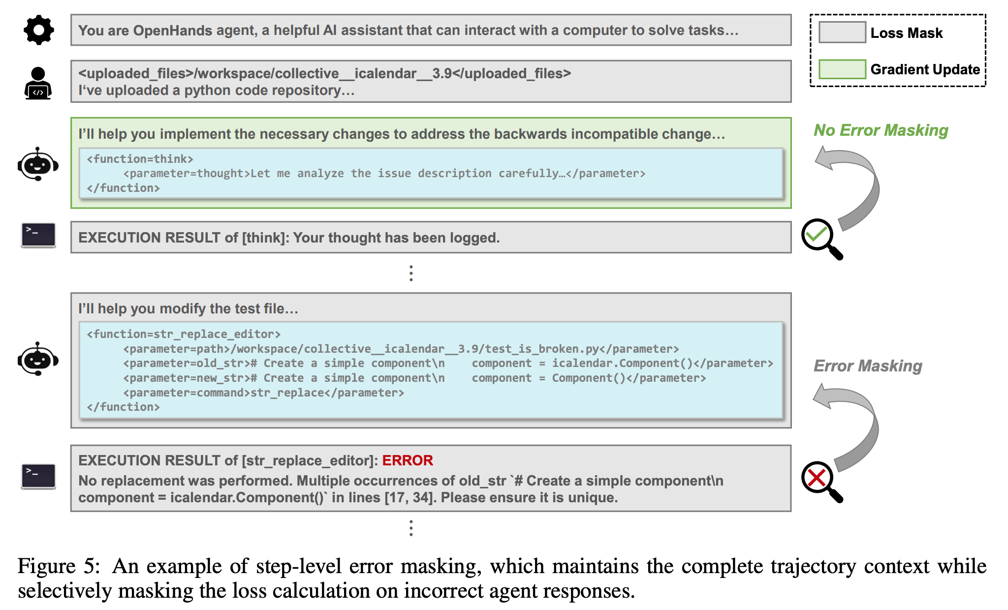 - error masking: tool call 에서 에러가 난 경우 (Incorrect Implementation, Localization Error) call 부분 mask
